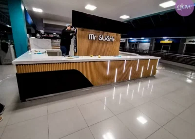 El Kiosco Mr. Sushi es un ejemplo claro de cómo Corporación Glow transforma espacios comerciales compactos en entornos únicos y funcionales, destacando siempre por su innovación y estilo.